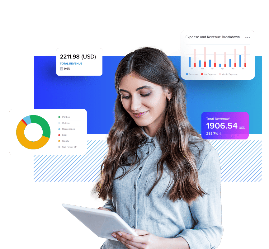| RolandDG Connect ブラウザやアプリで、プリントオペレーションを細部まで可視化。出力物のコスト計算やプリンターのコンディションチェックなど業務効率改善に貢献します。 |