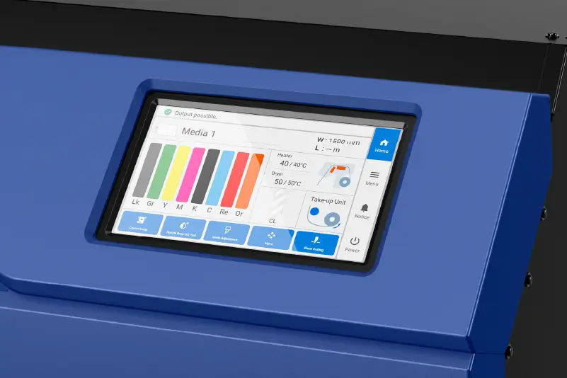 VG4には、使いやすく応答性の高い7インチカラー液晶タッチパネルが搭載されており、日々の操作を効率化します。タッチ一つで、インク残量、プリンターの状態、印刷時間などを確認できます。ジョブを選択して直接印刷を開始することもできます。